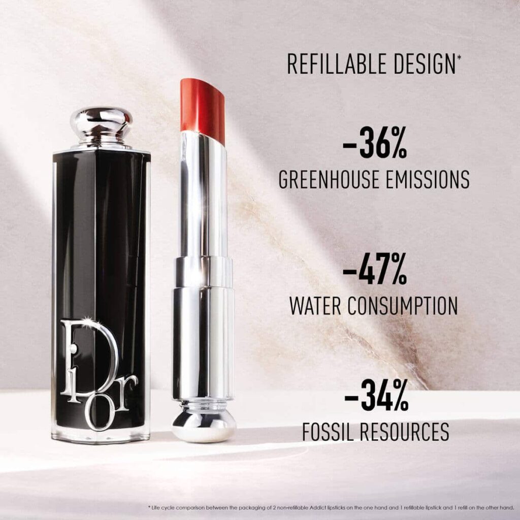 **** Life cycle comparison of the packaging of 2 non-refillable Dior Addict lipsticks vs. 1 refillable Dior Addict lipstick and 1 refill.