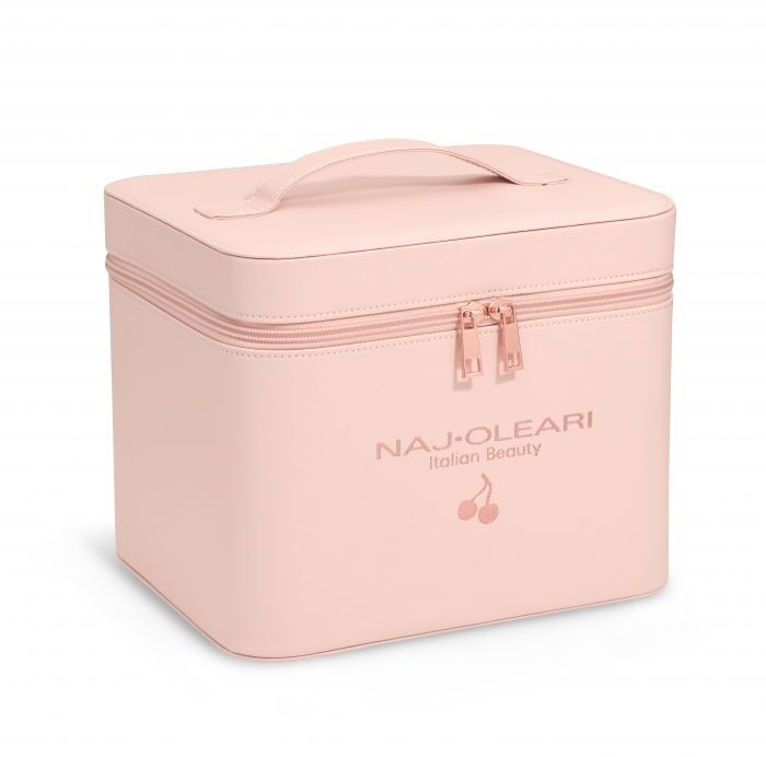 The elegant pink beauty case in saffiano effect is decorated with golden logo and golden cherry. The large mirror, the handle and rose gold zipper closure make the beauty perfect to travel as well.